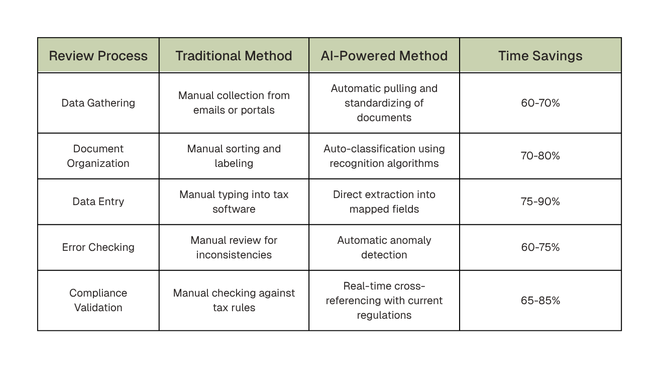Manual typing is dead weight. AI reads W-2s, 1099s, K-1s, and other docs with OCR, pulls out the numbers, and maps them into the return.
