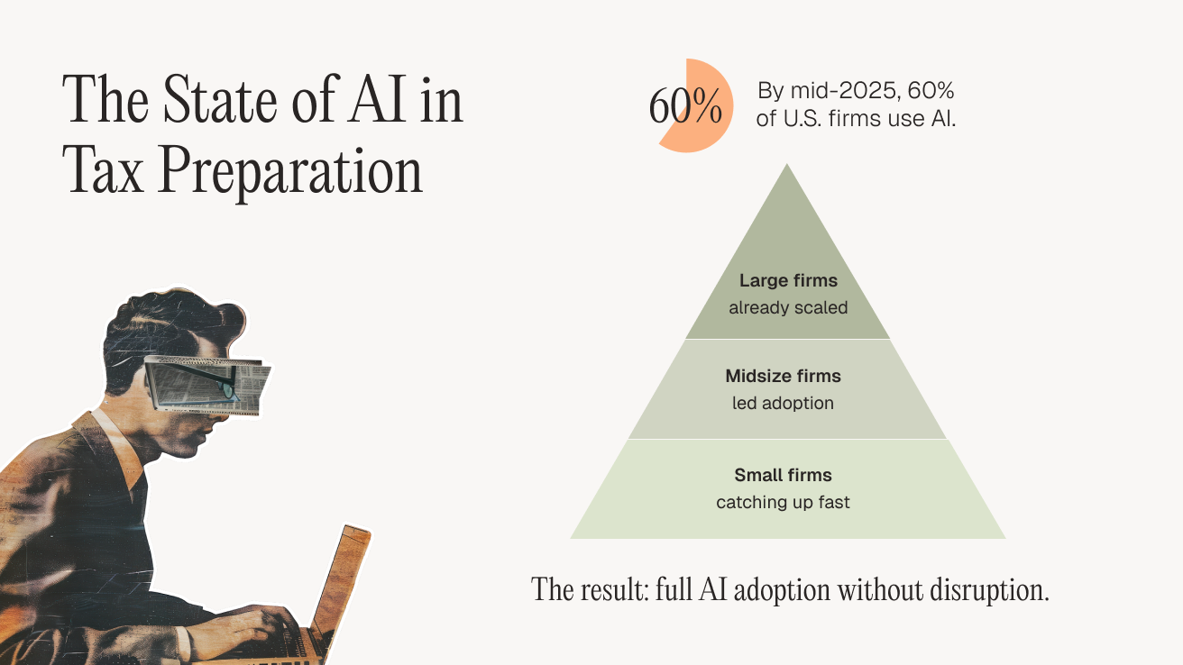 As of mid-2025, about 60% of U.S. firms are using AI somewhere in their tax workflows. Midsize and large firms moved first. Smaller practices are catching up because the math is too obvious to ignore.