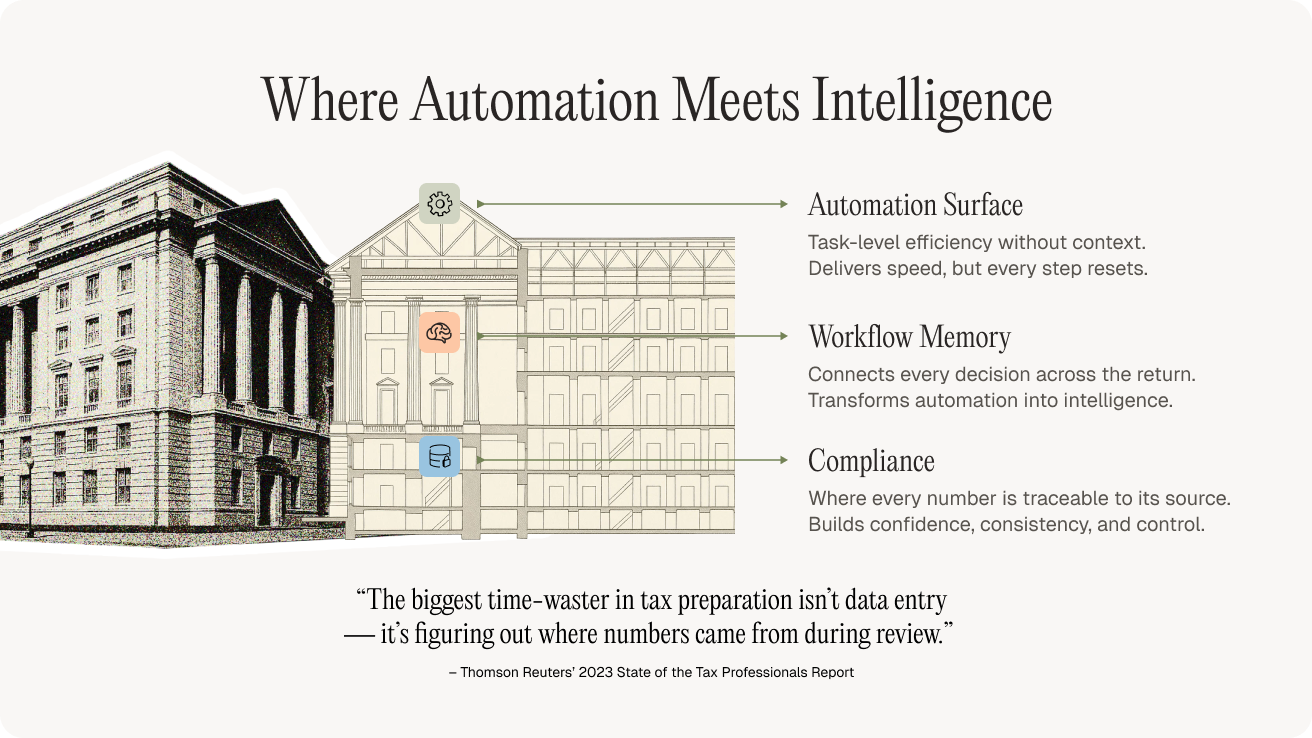 Workflow memory makes the difference between a tool that just automates typing and a system that actually thinks like a tax preparer.